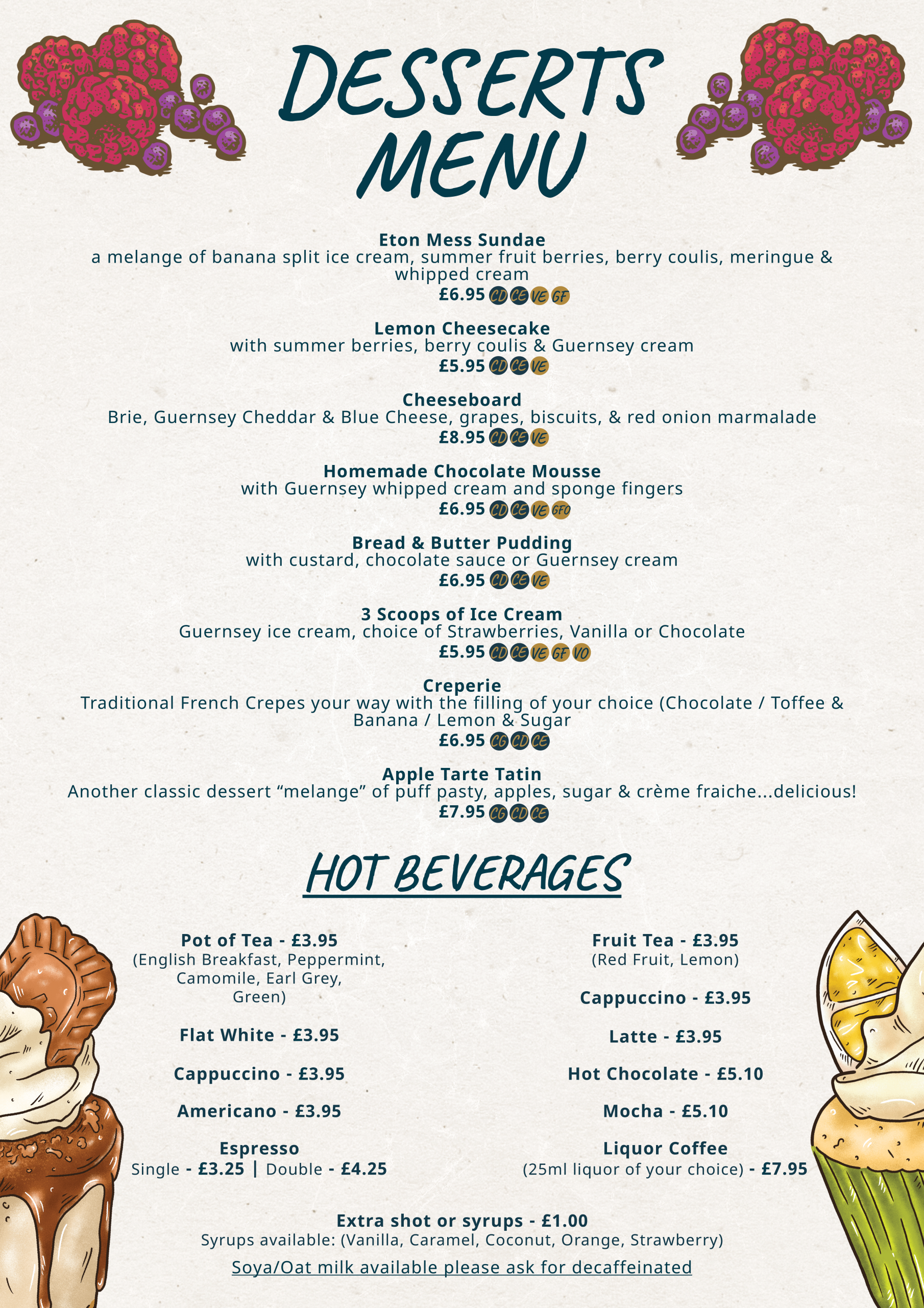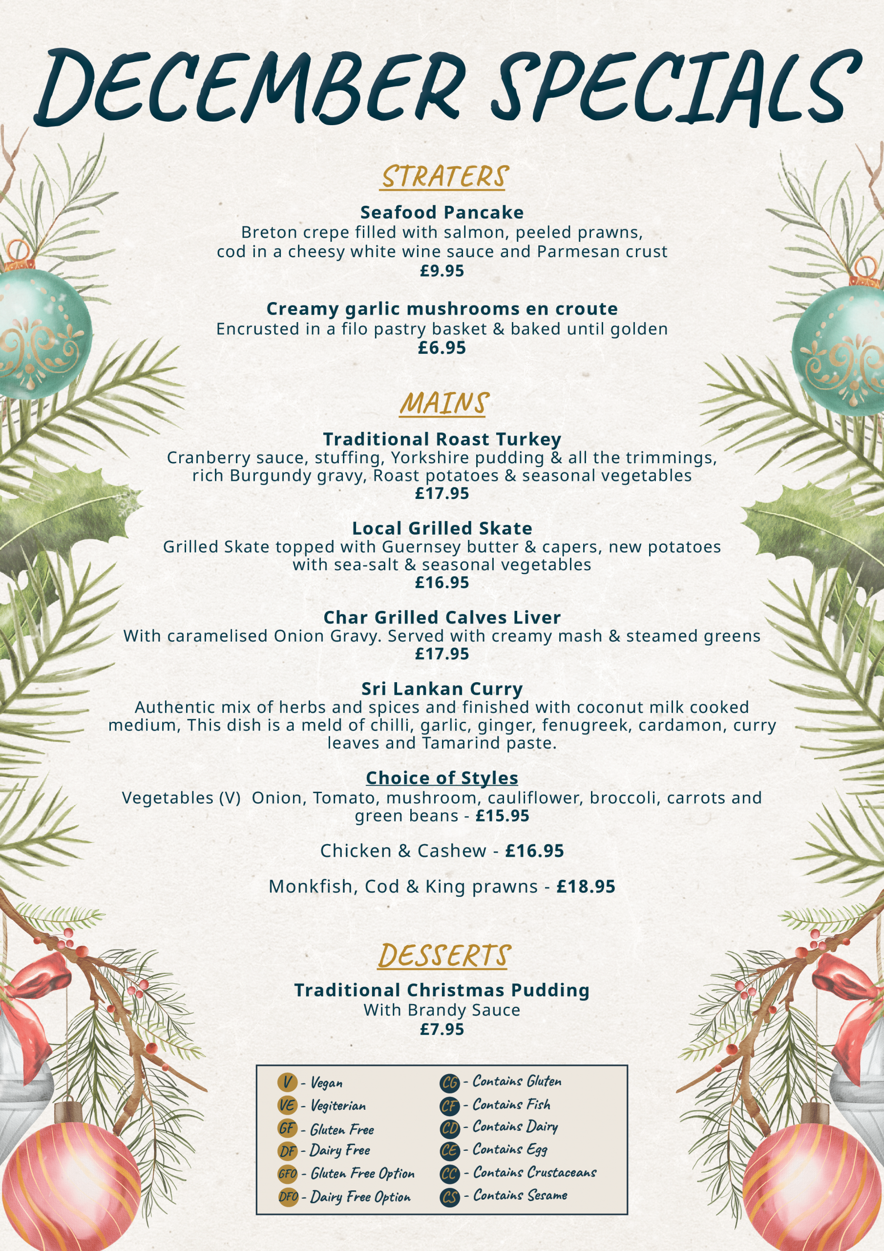 Bistro & Bar Menus Due to the Tennerfest 2025, some menus are temporarily unavailable during this time. Use the Book Your Table Today button to reserve your spot through our online system, or reach out via call, email, or Facebook to secure your date and table. Book Your Table Today 01481 264436 info@driftwoodinn.co.uk Message Us DECEMBER SPECIALS MENU BISTRO MENU LAZY SUNDAY MENU CHILDREN’S MENU DESSERTS & HOT DRINKS CHRISTMAS PARTY MENU THE NIGHT BEFORE MENU NEW YEAR’S EVE GALA MENU