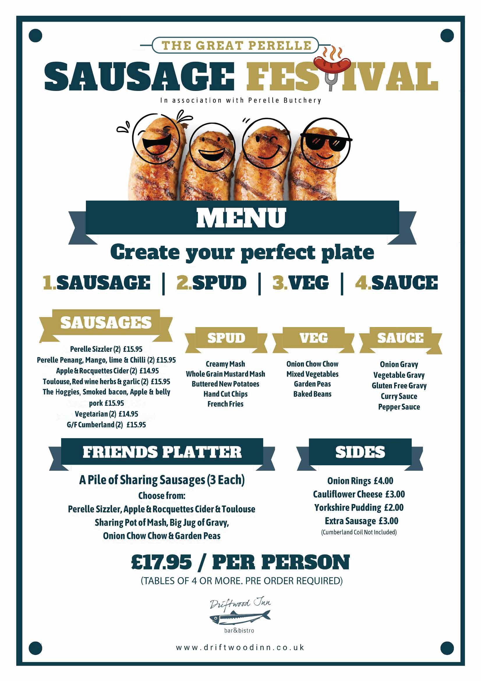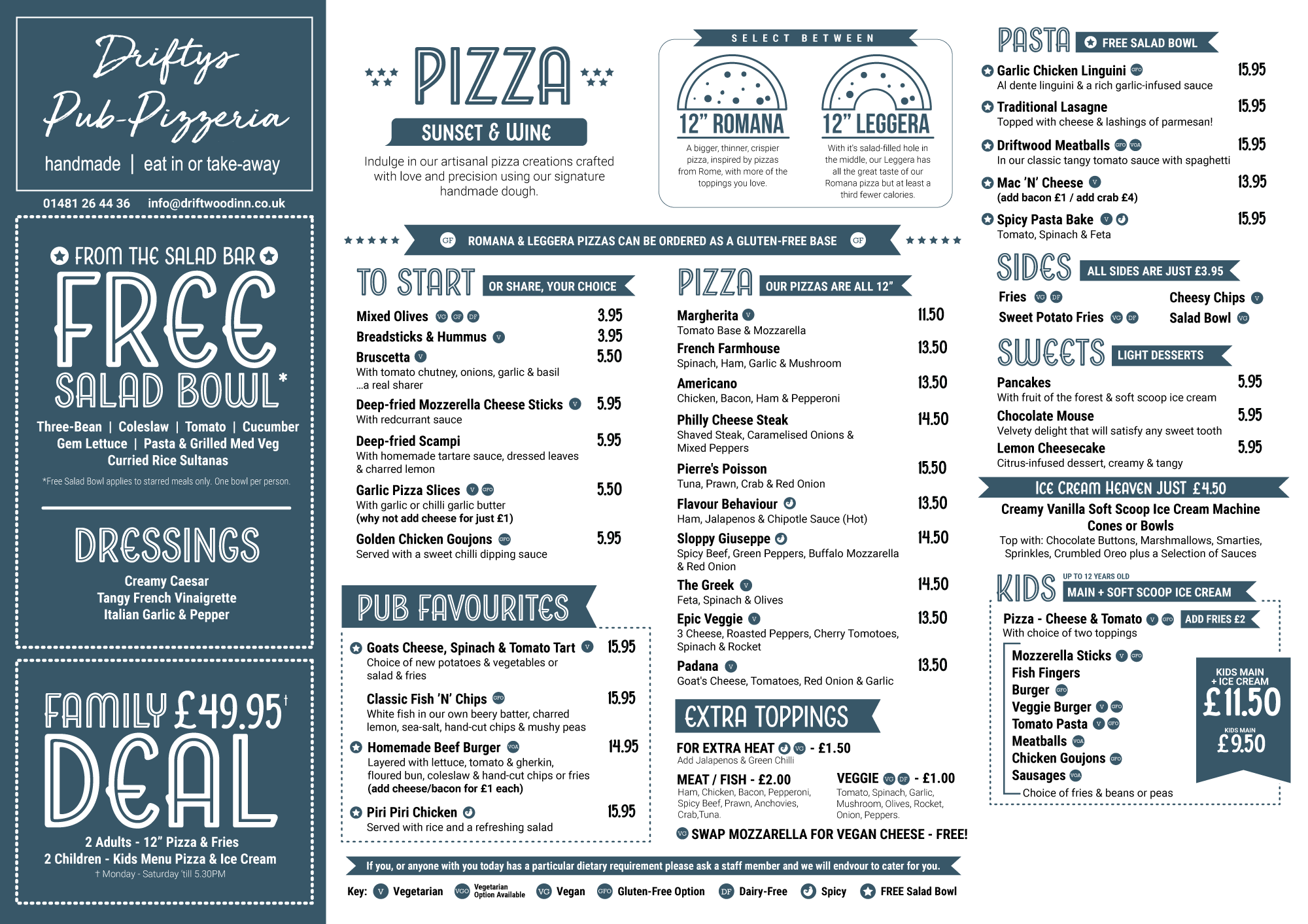 Bistro & Bar Menus Both the Bistro and Pub will be closed on Mondays throughout January and February. Use the Book Your Table Today button to reserve your spot through our online system, or reach out via call, email, or Facebook to secure your date and table. Book Your Table Today 01481 264436 info@driftwoodinn.co.uk Message Us THE BISTRO MENU THE VALUE LUNCH MENU THE SAUSAGE FESTIVAL MENU THE LAZY SUNDAY MENU DESSERTS & HOT DRINKS THE CHILDREN’S MENU DRIFTYS PUB PIZZERIA MENU