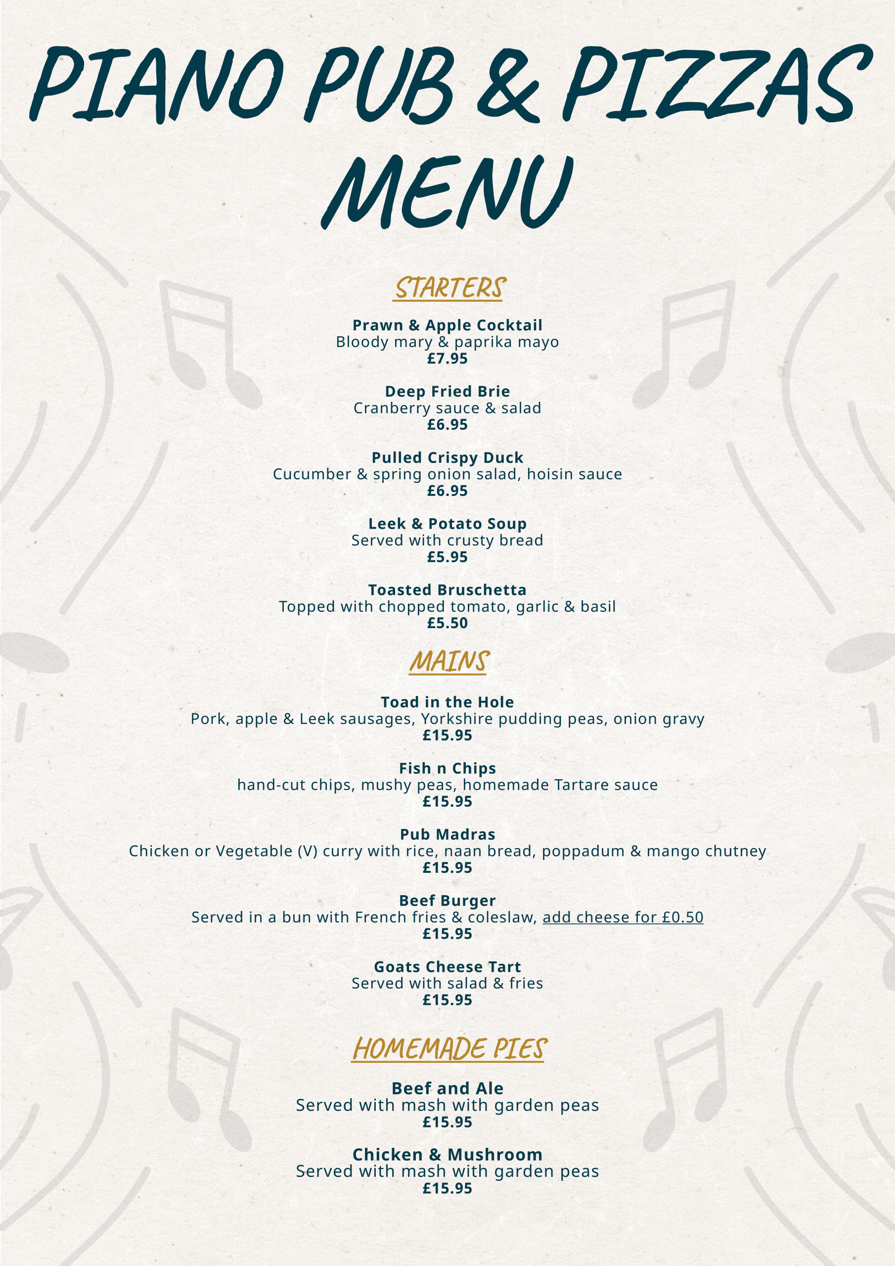 Bistro & Bar Menus Both the Bistro and Pub will be closed on Mondays throughout January and February. Use the Book Your Table Today button to reserve your spot through our online system, or reach out via call, email, or Facebook to secure your date and table. Book Your Table Today 01481 264436 info@driftwoodinn.co.uk Message Us THE BISTRO MENU THE VALUE LUNCH MENU THE SAUSAGE FESTIVAL MENU THE LAZY SUNDAY MENU DESSERTS & HOT DRINKS THE CHILDREN’S MENU PUB PIANO PIZZA MENU DRIFTYS PUB PIZZERIA MENU