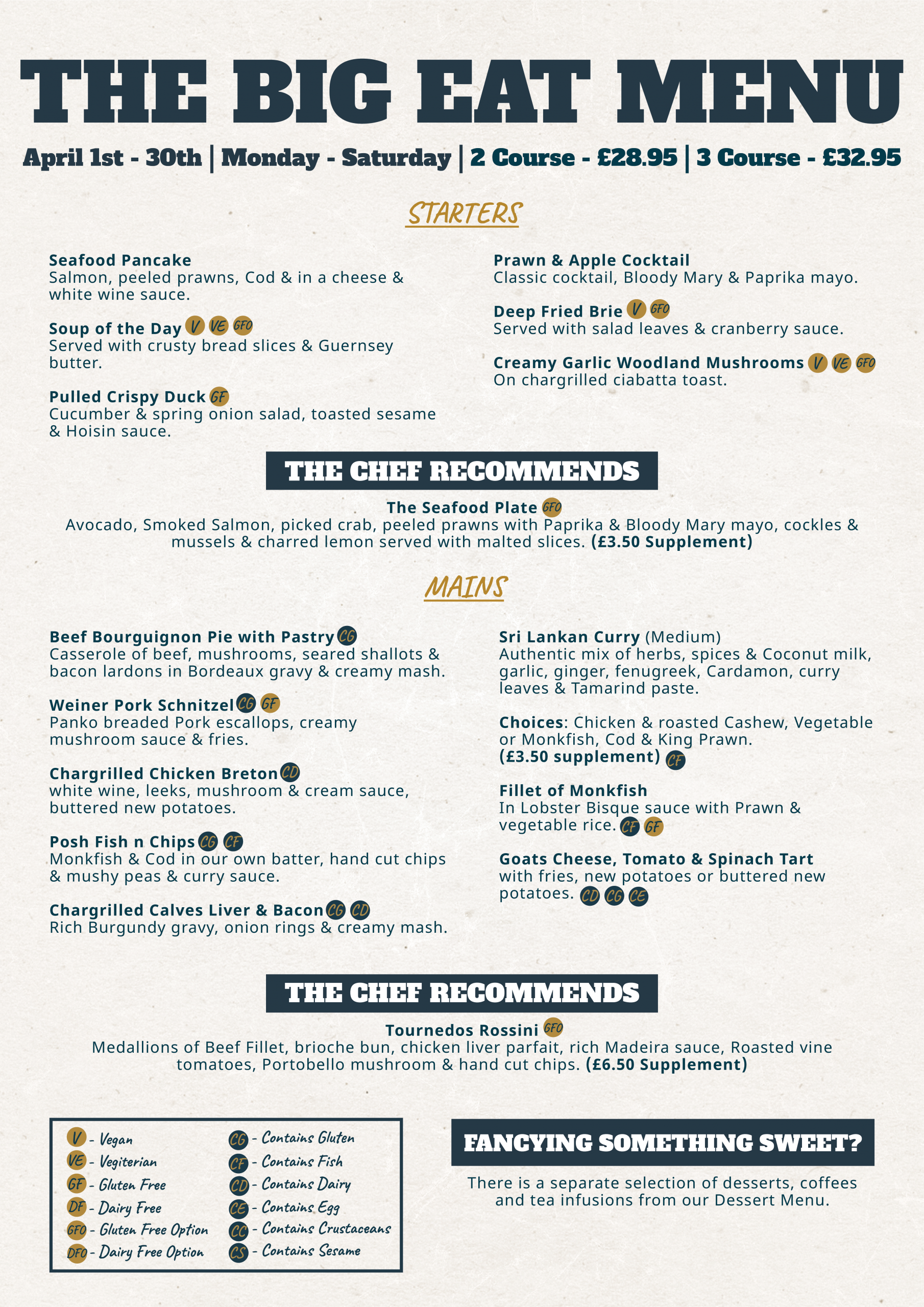 Bistro & Bar Menus Both the Bistro and Pub will be closed on Mondays throughout March. Use the Book Your Table Today button to reserve your spot through our online system, or reach out via call, email, or Facebook to secure your date and table. Book Your Table Today 01481 264436 info@driftwoodinn.co.uk Message Us THE VALUE LUNCH MENU THE BISTRO MENU THE LAZY SUNDAY MENU DESSERTS & HOT DRINKS THE CHILDREN’S MENU THE BIG EAT MENU DRIFTYS PUB PIZZERIA MENU
